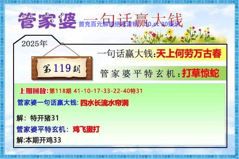 | 121期管家婆一句话:开出三五两心数 解:开出三五两心数,解大数特码25-49,解单肖兔牛猪鸡羊蛇 综合:牛兔龙羊鸡狗 |